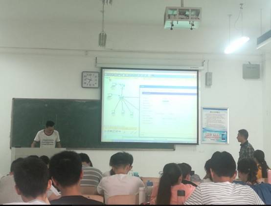 课前,康鲲鹏老师向大家展示自申请范式改革项目以来的泛雅平台的建设情况,并现场登录到泛雅平台,给大家展示了平台上的课件、视频、实验包以及以往讨论的内容、作业等。教学开始后他采用翻转课堂教学方式,简单介绍了本次课的内容,然后将课堂交给了同学们,同学们根据课下通过学习通登录泛雅平台预习的内容,以任务为驱动,采用递进的方式在Packet Tracer上演示并讲解了单臂路由器实现虚拟局域网间通信的实验。期间,康鲲鹏老师对学生的讲课和实验做了指导。