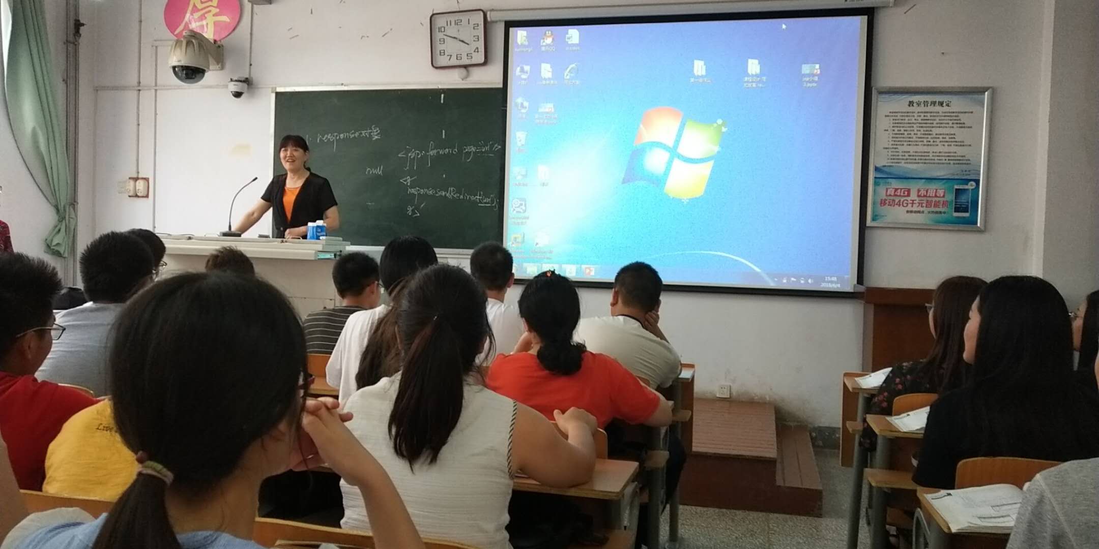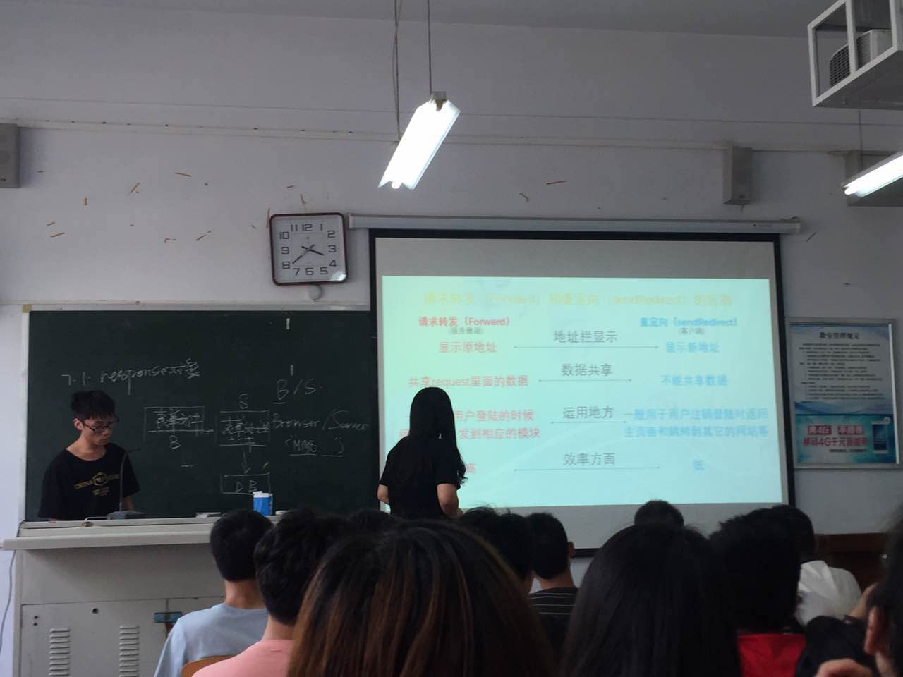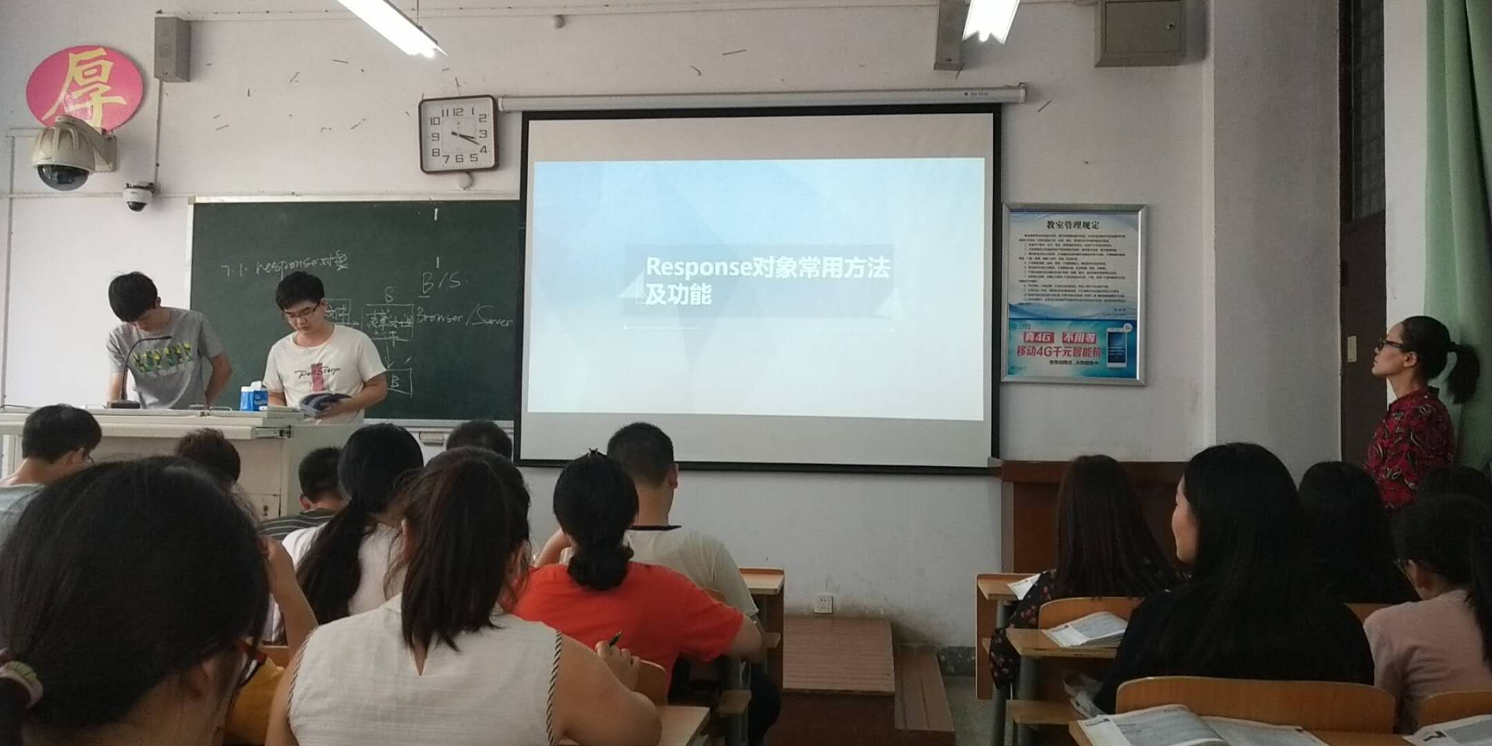 课上孙红丽老师采用翻转课堂教学方式,通过B/S模式的实现原理结合用户注册功能实例实现,引入本节课主要内容response对象基本功能与常用方法。简单讲解了response对象功能后,将课堂交给学生。按照班级分组,学习任务提前分配给学生,学生通过前期学习,制作课件,编写代码实例。课堂上每组学生采用一人主讲一个辅助方式讲解汇报自己学生成果,老师在学生汇报后做以补充与总结。