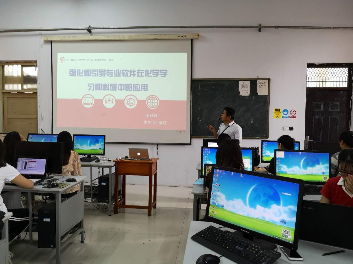 6月28日上午第三节,化学化工学院王科峰老师的《计算机在化学中应用》范式改革公开课在文化路校区音乐楼三楼机房举行。李淑萍教授、化学化工学院副院长孟团结和部分教师参加了教学范式改革观摩教学。